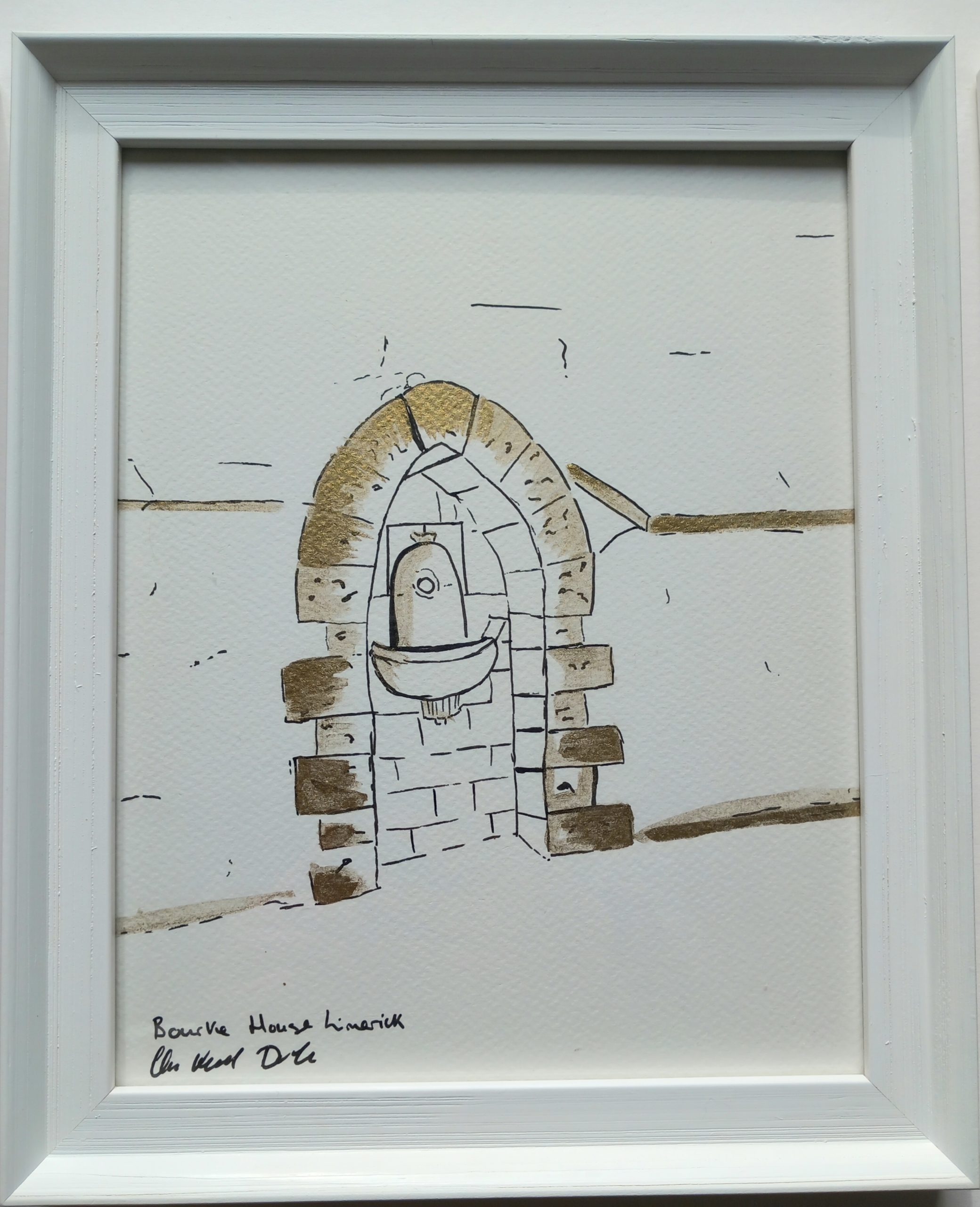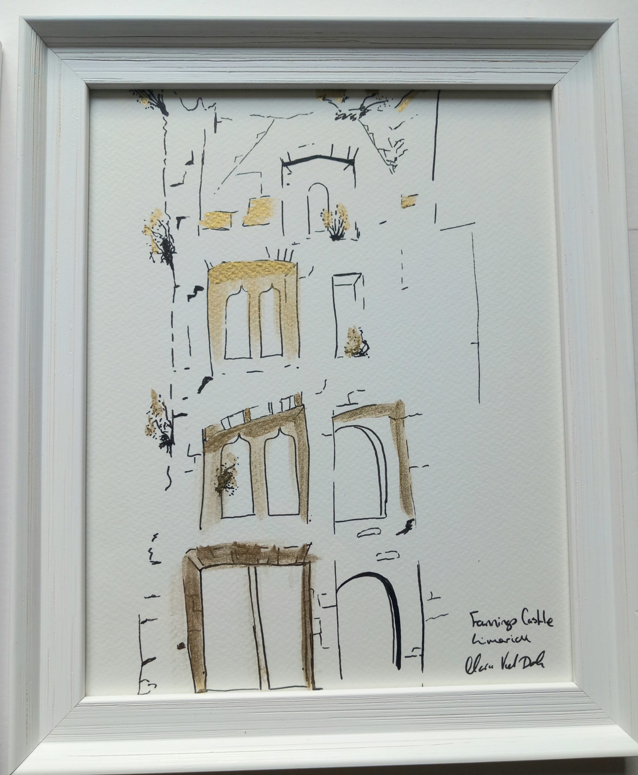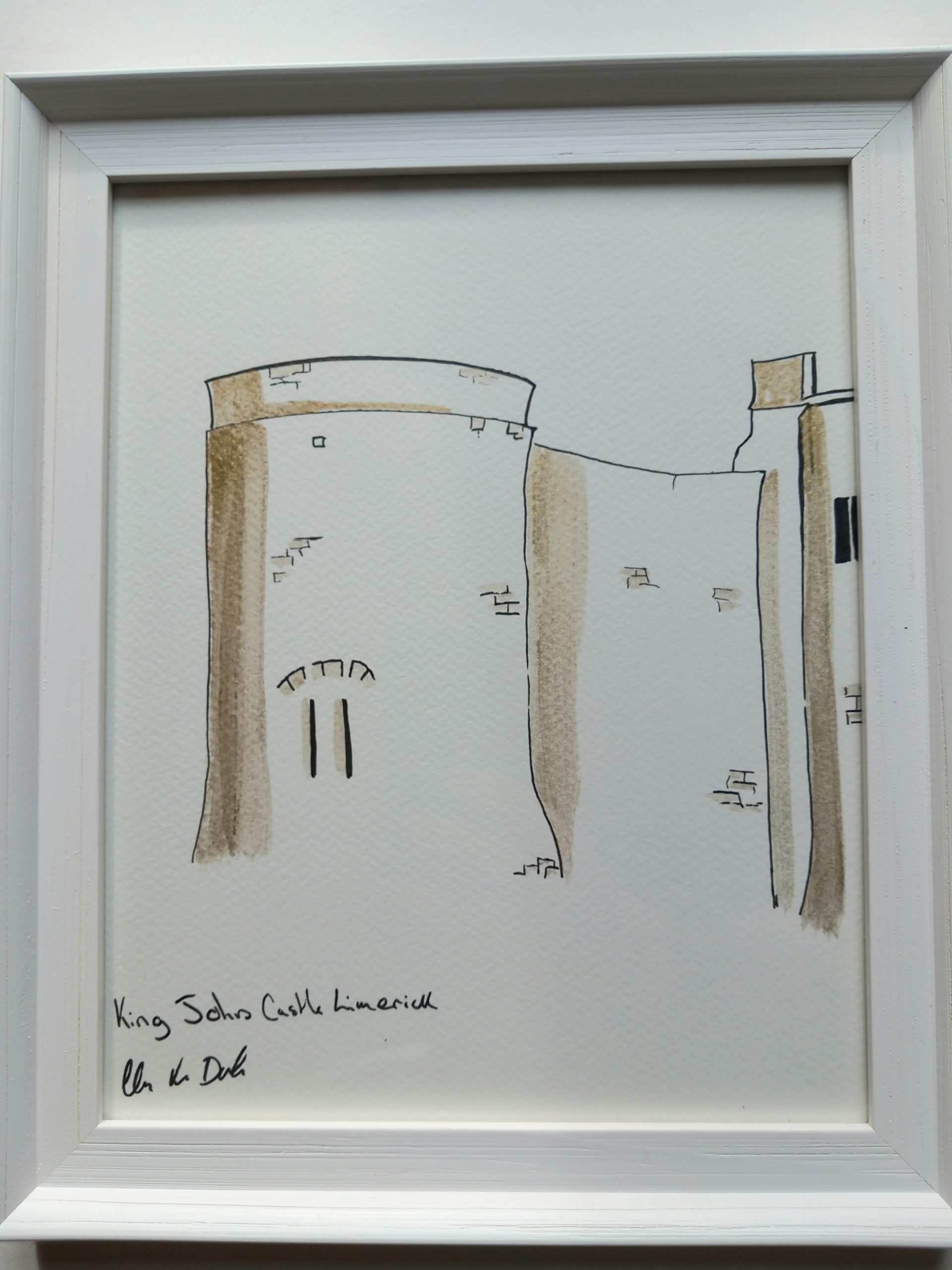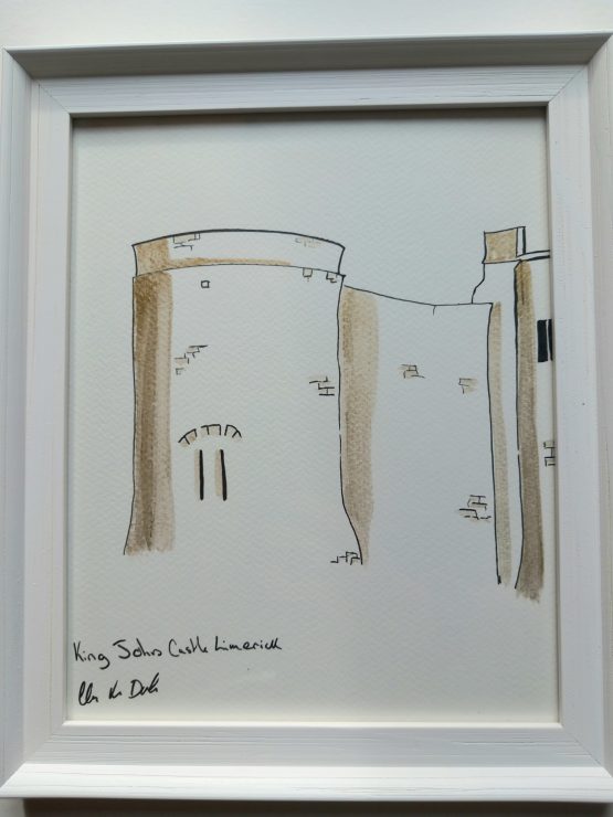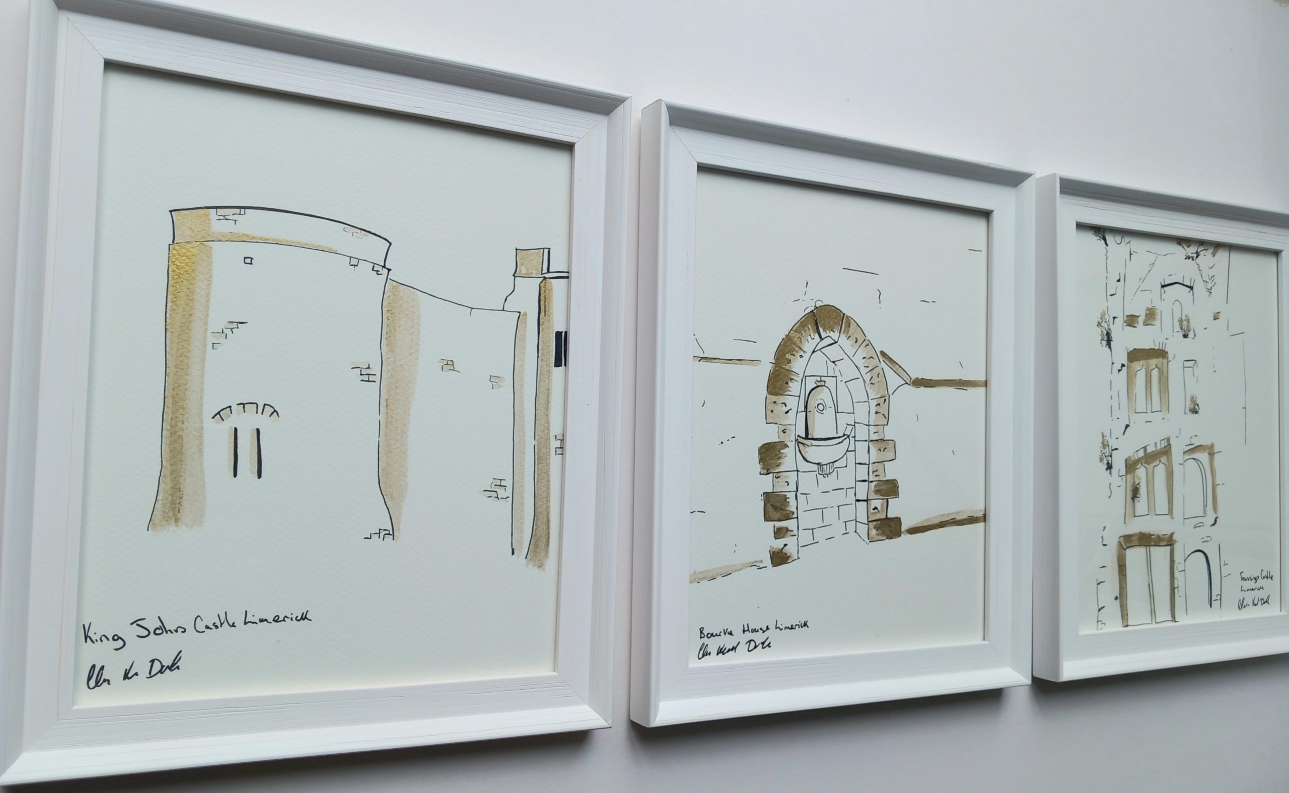 Set of three framed drawings of King John’s Castle, Bourkes House Watering Fountain and Fannings Castle, all prominent historical buildings in Limerick City. Delicately created by Clara Keating Dolan in black pen and gold ink.